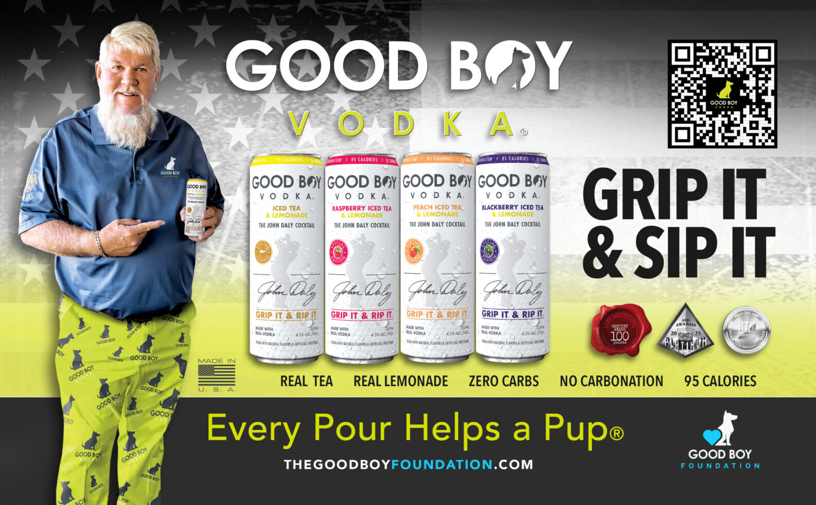 Good Boy Vodka offers various ready-to-drink cocktails, including non-carbonated John Daly-inspired iced tea and lemonade drinks, and carbonated hard seltzers with fruit flavors like pineapple and strawberry. The John Daly cocktails feature zero sugar and carbs, while the seltzers are low-calorie and contain natural fruit juices and Stevia. The brand is also committed to philanthropic efforts, particularly supporting veterans and K9 units.